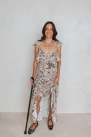 Angel wears the Snow Leopard Bias Mini Dress which features a a lightweight fabric that offers breathable comfort and a barely-there feel helping reduce sensory overload and maximise comfort.