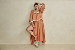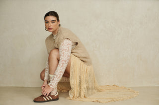 Silky reimagining of some of our most beloved silhouettes, with handkerchief hems and delicate contrasting lace. Styled back with blue denim or ivory lace, this story embodies the chameleon-like qualities of feminine duality.