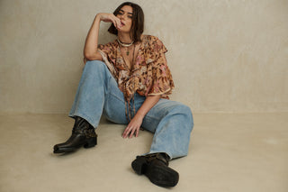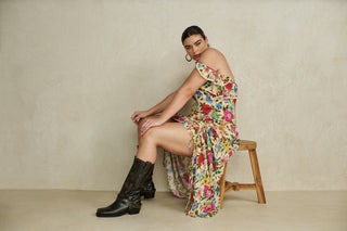 The embodiment of modern romance ~ rich hand drawn florals with delicate details throughout. Lean into the whimsy with tonal accessories or add a rebellious edge with biker boots.